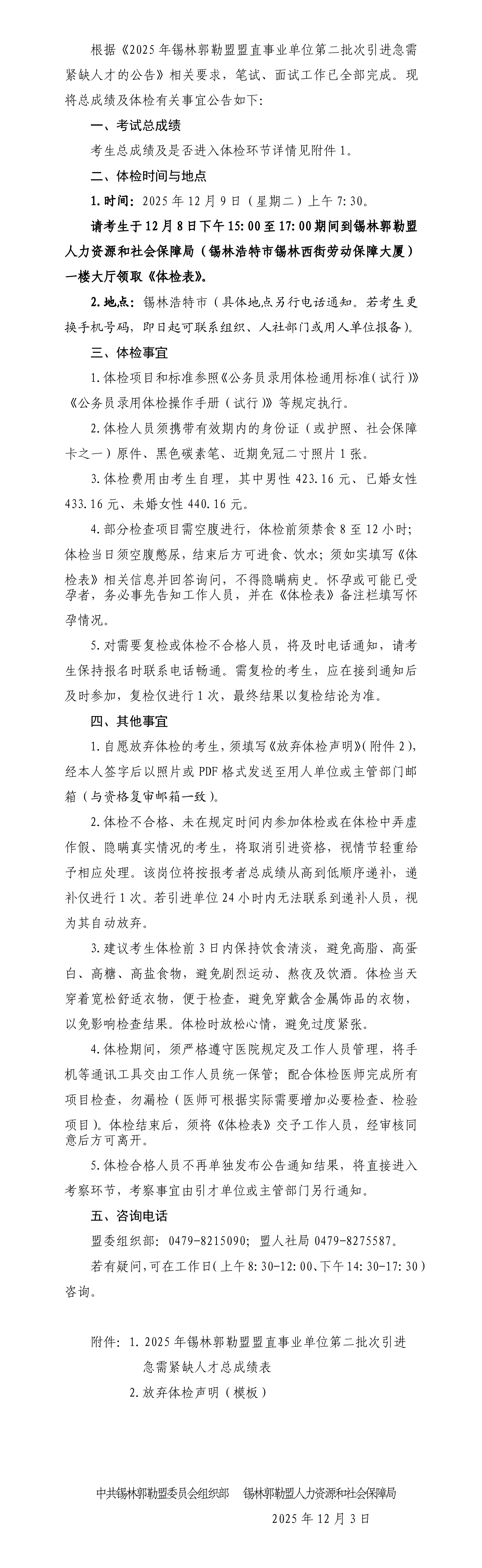 關(guān)于公布2025年錫林郭勒盟 盟直事業(yè)單位第二批次引進(jìn)急需緊缺人才總成績(jī)和體檢事宜的公告