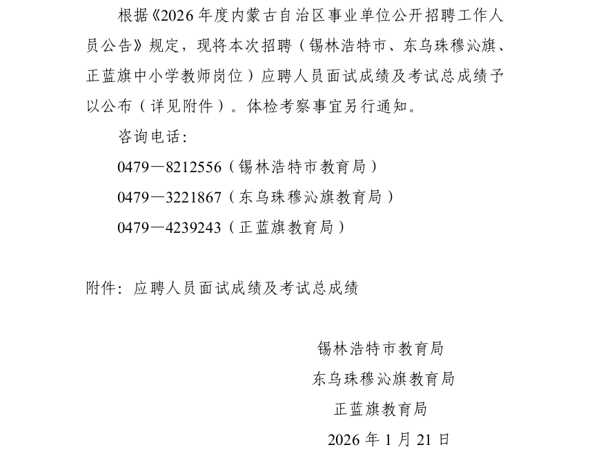 關(guān)于公布2026年度內(nèi)蒙古自治區(qū)事業(yè)單位公開招聘(錫林浩特市、東烏珠穆沁旗、正藍(lán)旗中小學(xué)教師崗位)面試成績及考試總成績的公告